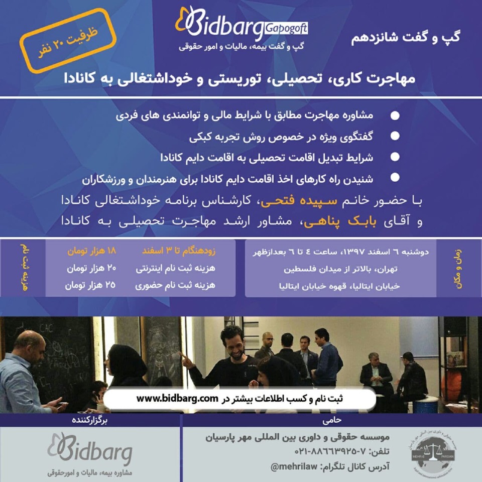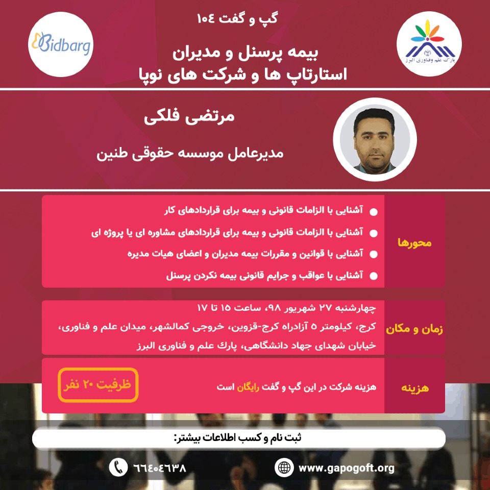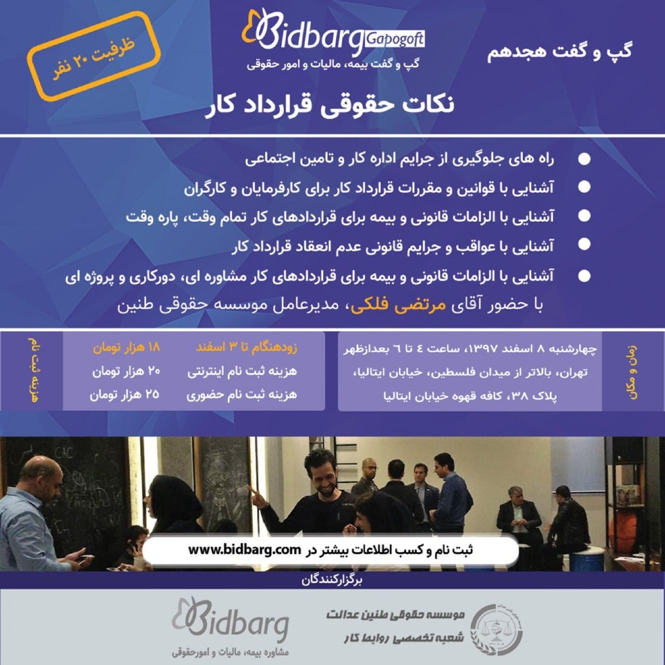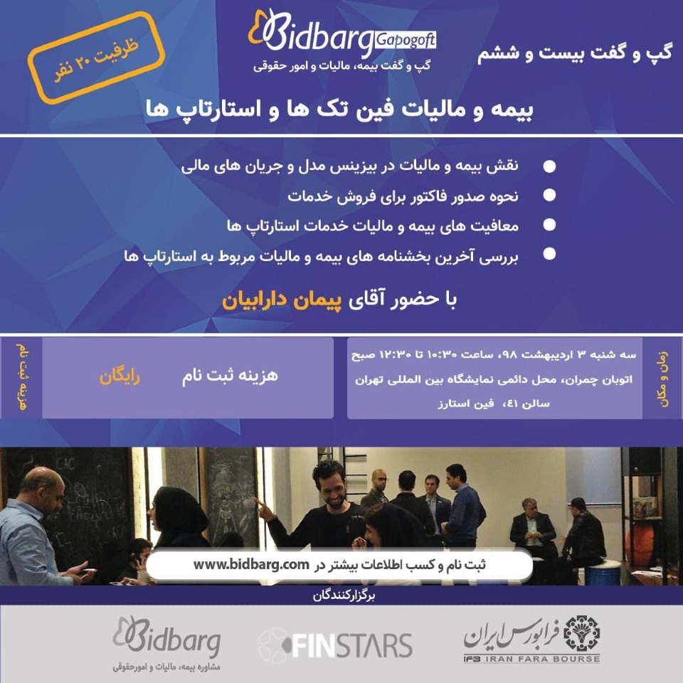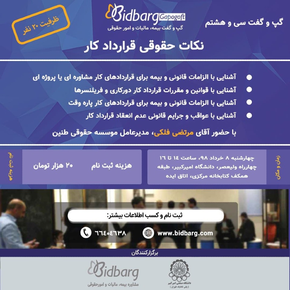 بیدبرگ (شرکت ارتباط گستر بیدبرگ) از آبان سال ۱۳۹۳ شروع به کار کرده است و بر طبق رتبه بندی سایت معتبر Alexa، اکنون جزو ۵۰۰ سایت پربازدید ایران می باشد. بیدبرگ در مرکز توسعه نوآوری دانشگاه صنعتی امیرکبیر مستقر می باشد. بیدبرگ مشاور آگاه شما در حوزه بیمه، مالیات و امور حقوقی می باشد. از طریق بیدبرگ می توانید در همه حوزه های بیمه، قانون کار، مالیات، امور حقوقی و کیفری، مشاوره تلفنی تخصصی دریافت کنید یا پیگیری و اجرای امور خود را به متخصصین همکار بیدبرگ بسپارید. برای ارتباط با پشتیبانی بیدبرگ با شماره تلفنی ۰۲۱۹۱۰۲۳۷۸۴ تماس بگیرید یا درخواست خود را از طریق فرم زیر به اطلاع ما برسانید. https://www.bidbarg.com