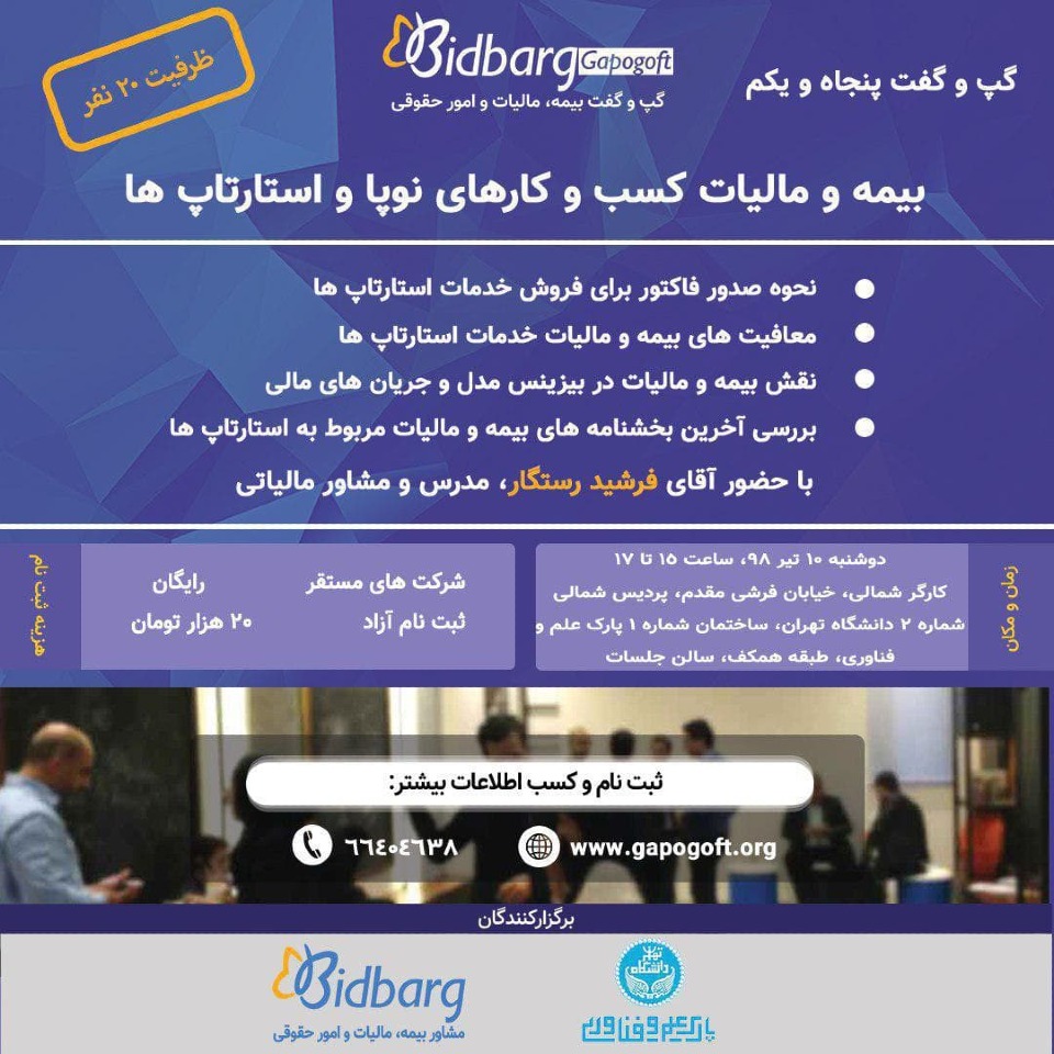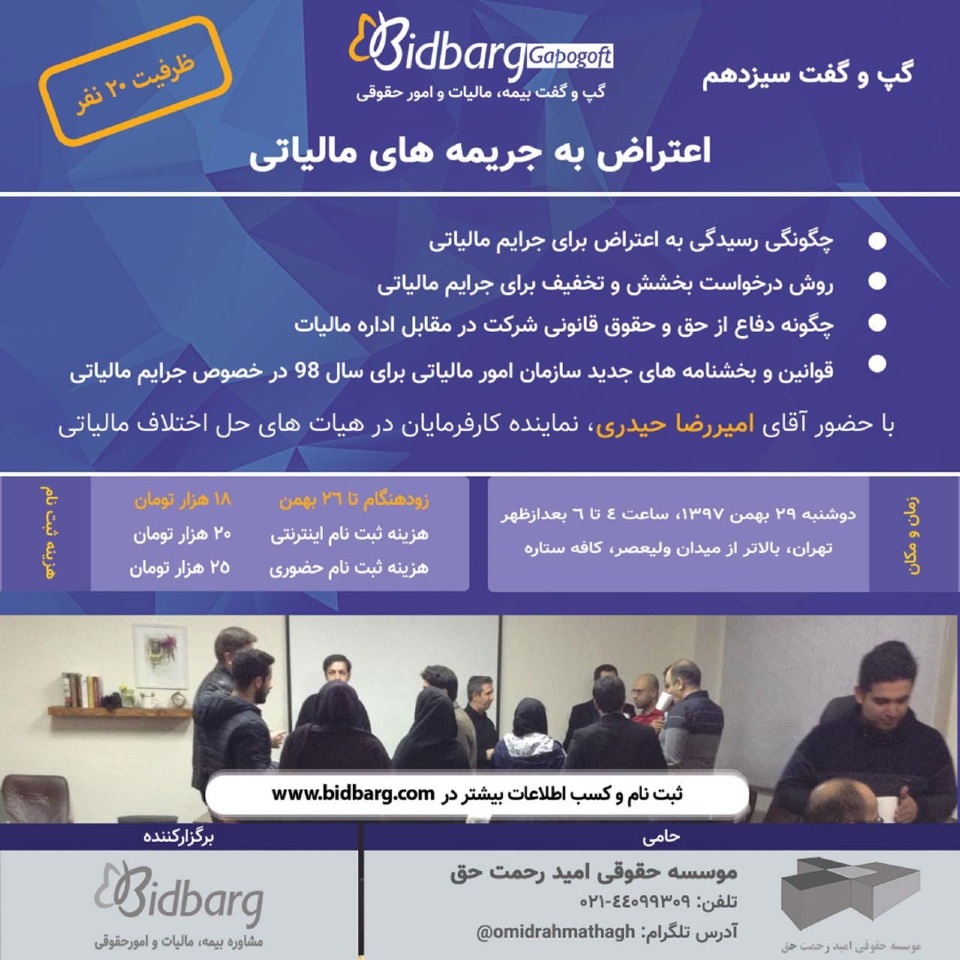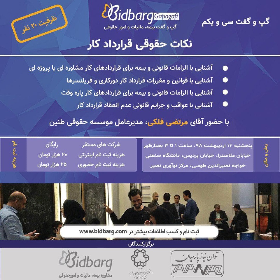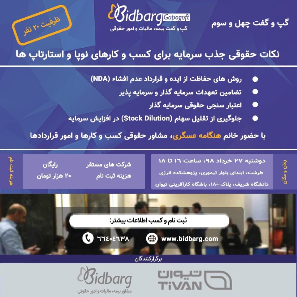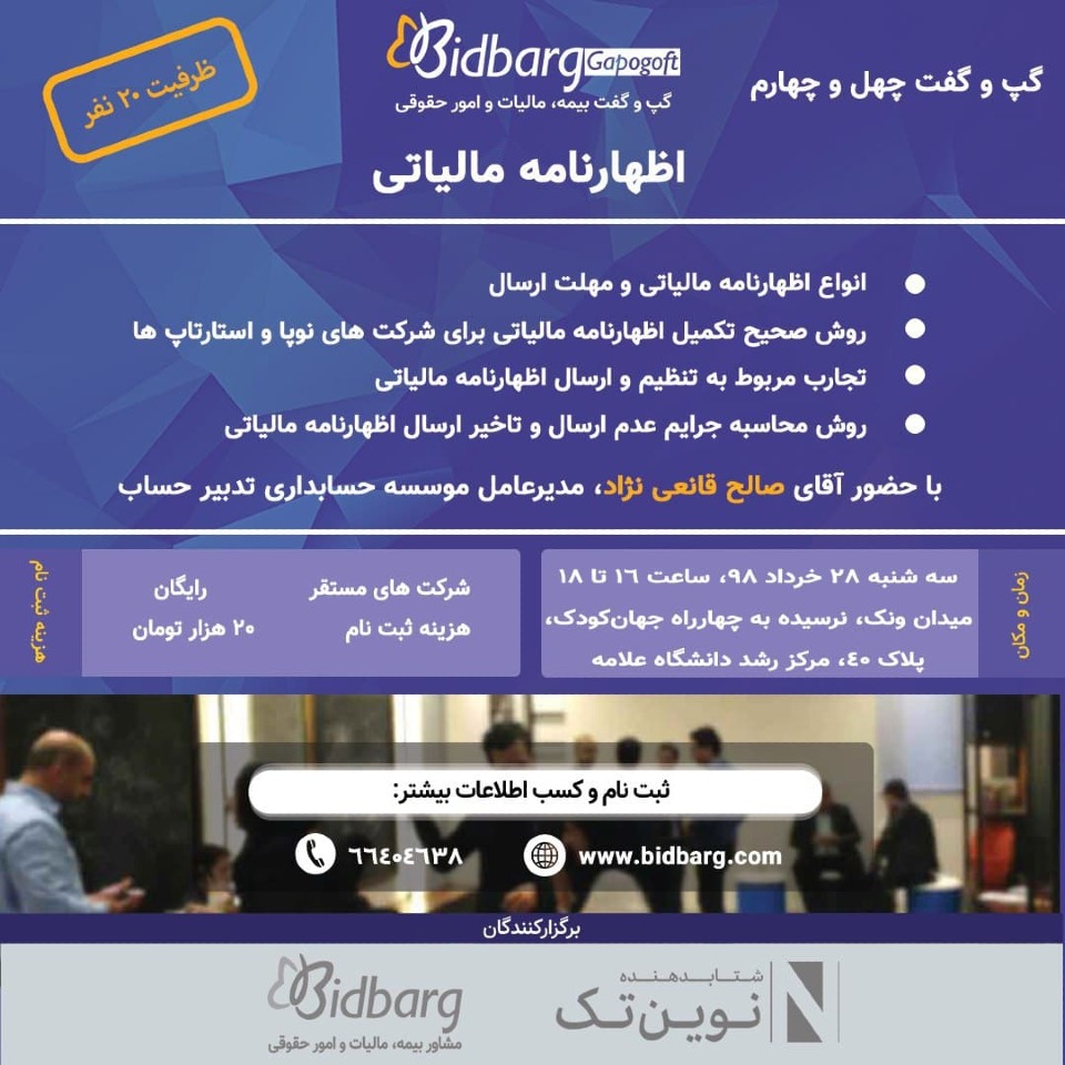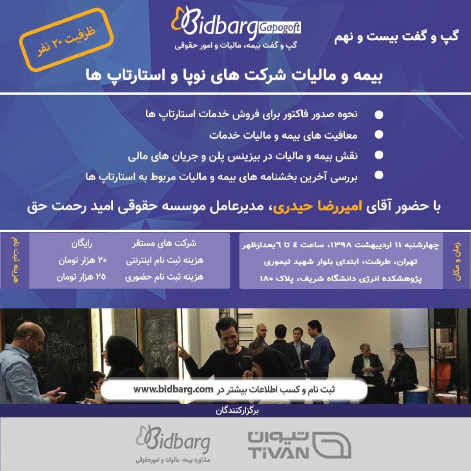 بیدبرگ (شرکت ارتباط گستر بیدبرگ) از آبان سال ۱۳۹۳ شروع به کار کرده است و بر طبق رتبه بندی سایت معتبر Alexa، اکنون جزو ۵۰۰ سایت پربازدید ایران می باشد. بیدبرگ در مرکز توسعه نوآوری دانشگاه صنعتی امیرکبیر مستقر می باشد. بیدبرگ مشاور آگاه شما در حوزه بیمه، مالیات و امور حقوقی می باشد. از طریق بیدبرگ می توانید در همه حوزه های بیمه، قانون کار، مالیات، امور حقوقی و کیفری، مشاوره تلفنی تخصصی دریافت کنید یا پیگیری و اجرای امور خود را به متخصصین همکار بیدبرگ بسپارید. برای ارتباط با پشتیبانی بیدبرگ با شماره تلفنی ۰۲۱۹۱۰۲۳۷۸۴ تماس بگیرید یا درخواست خود را از طریق فرم زیر به اطلاع ما برسانید. https://www.bidbarg.com