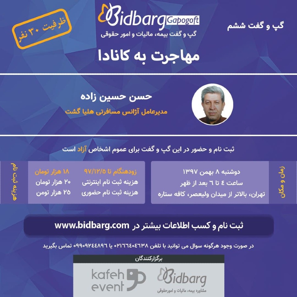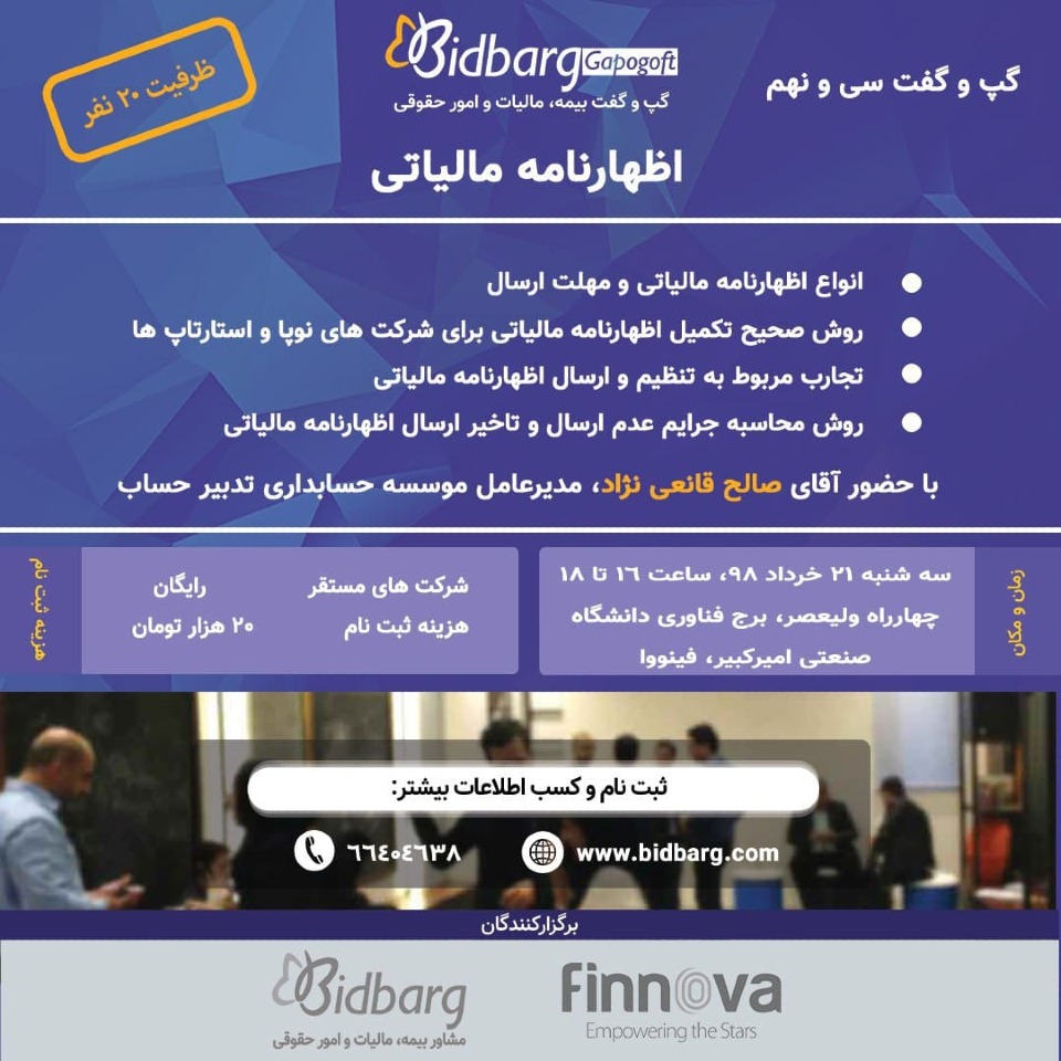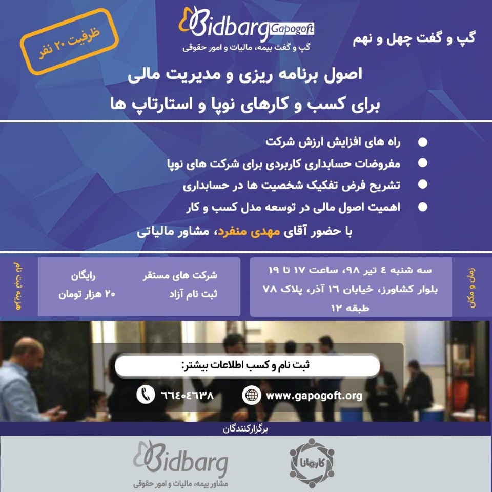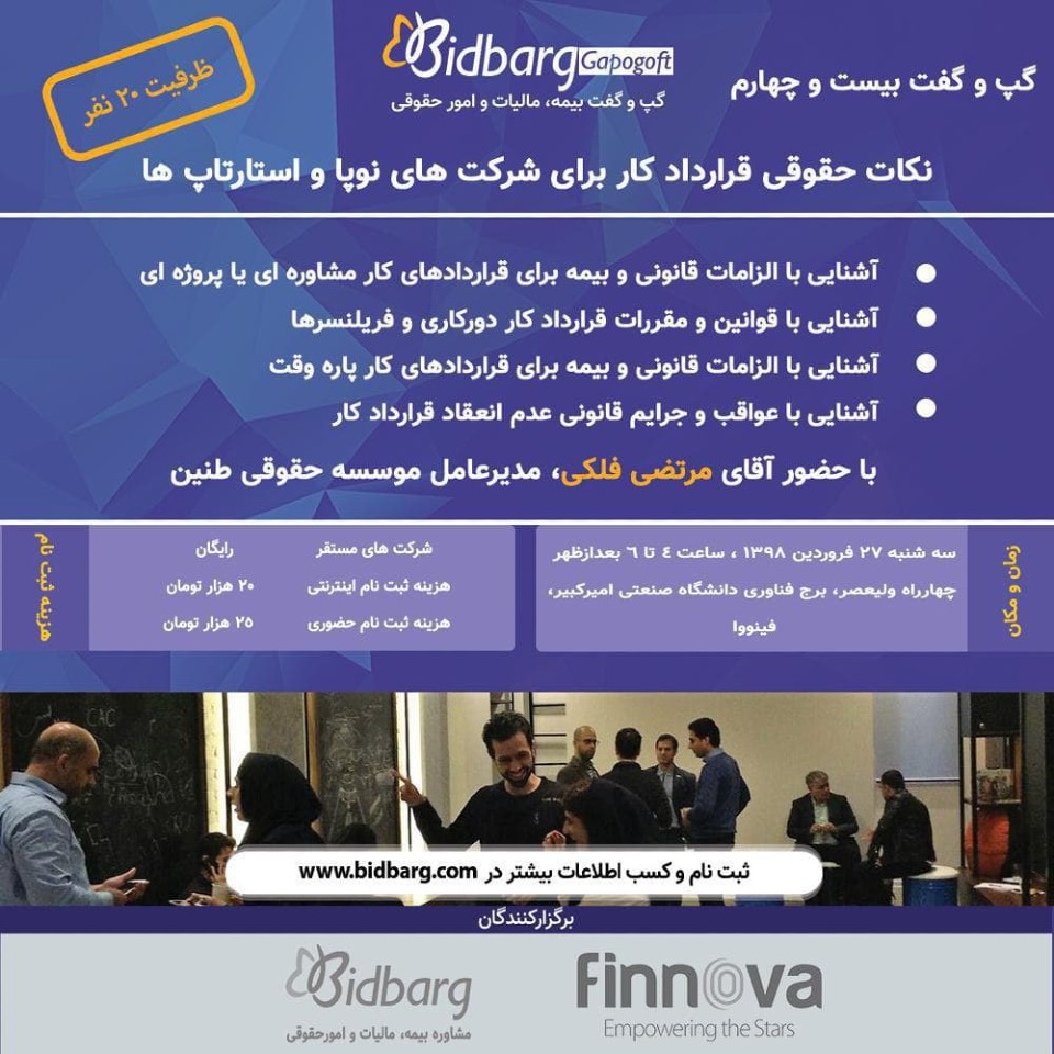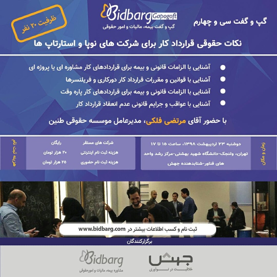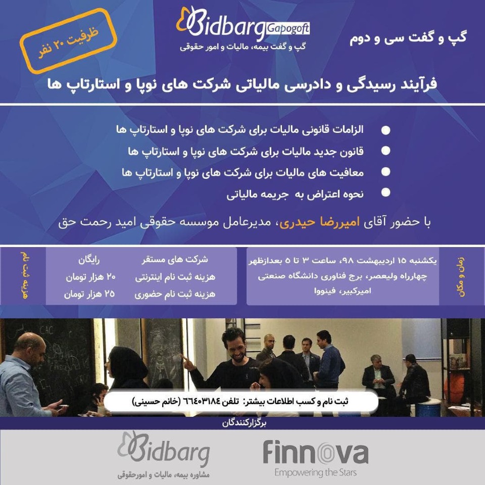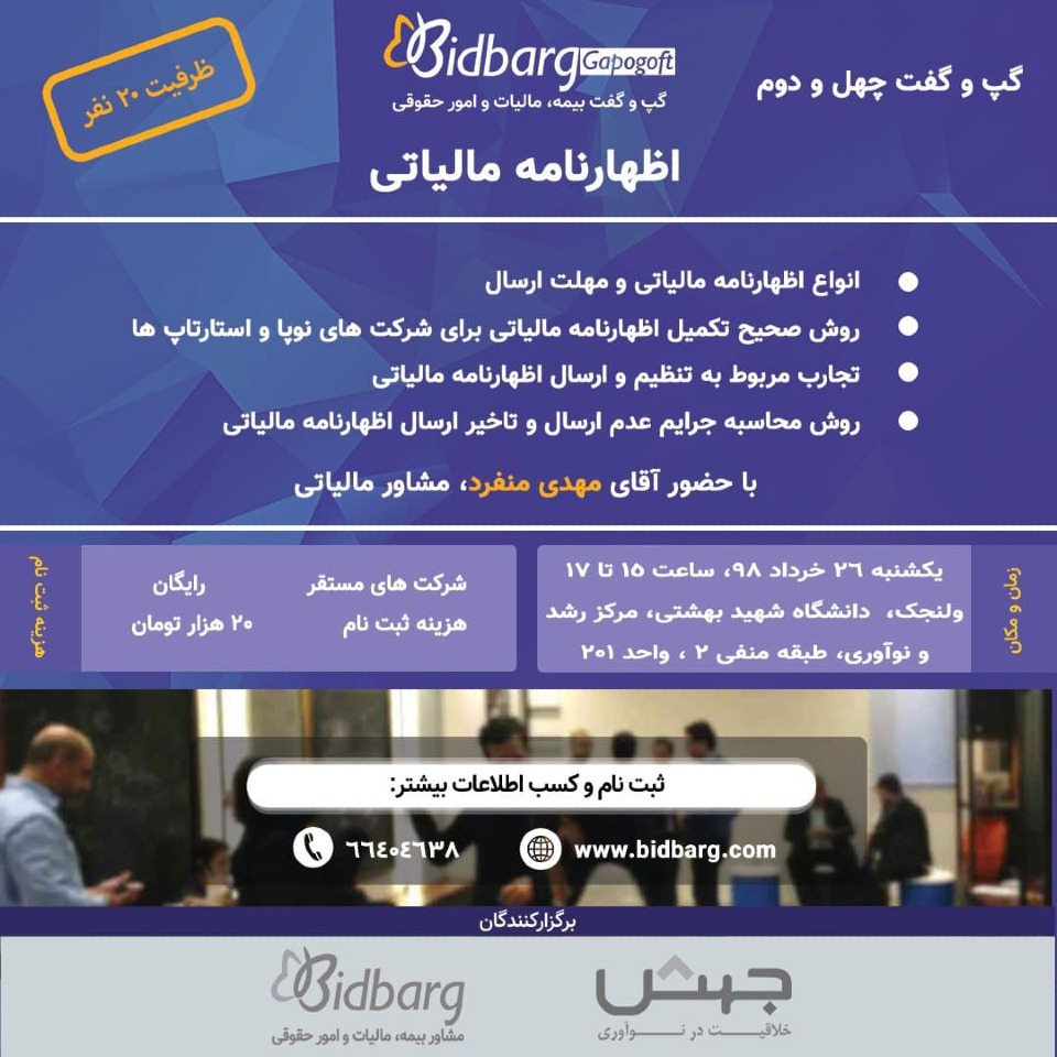 بیدبرگ (شرکت ارتباط گستر بیدبرگ) از آبان سال ۱۳۹۳ شروع به کار کرده است و بر طبق رتبه بندی سایت معتبر Alexa، اکنون جزو ۵۰۰ سایت پربازدید ایران می باشد. بیدبرگ در مرکز توسعه نوآوری دانشگاه صنعتی امیرکبیر مستقر می باشد. بیدبرگ مشاور آگاه شما در حوزه بیمه، مالیات و امور حقوقی می باشد. از طریق بیدبرگ می توانید در همه حوزه های بیمه، قانون کار، مالیات، امور حقوقی و کیفری، مشاوره تلفنی تخصصی دریافت کنید یا پیگیری و اجرای امور خود را به متخصصین همکار بیدبرگ بسپارید. برای ارتباط با پشتیبانی بیدبرگ با شماره تلفنی ۰۲۱۹۱۰۲۳۷۸۴ تماس بگیرید یا درخواست خود را از طریق فرم زیر به اطلاع ما برسانید. https://www.bidbarg.com