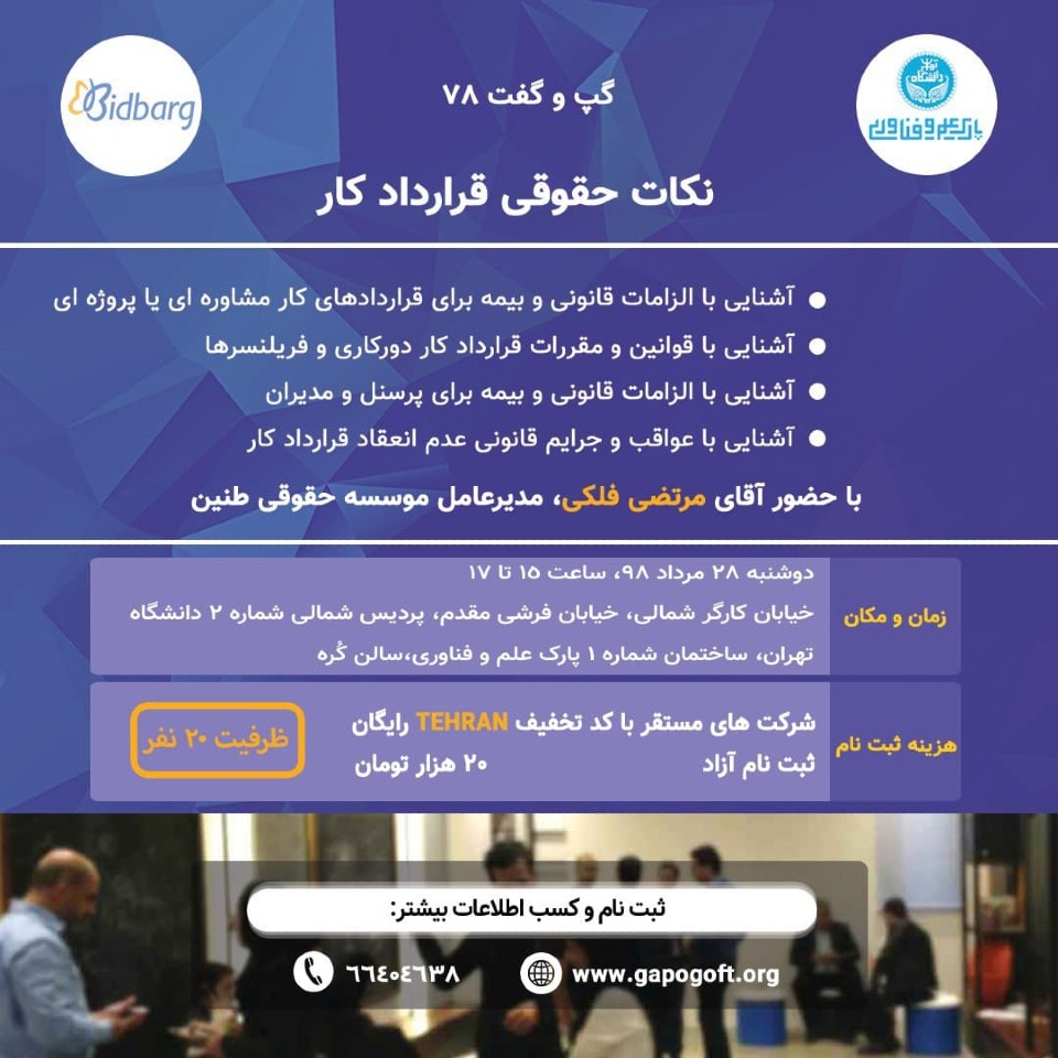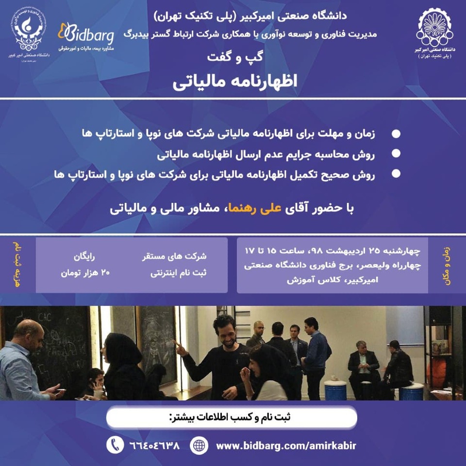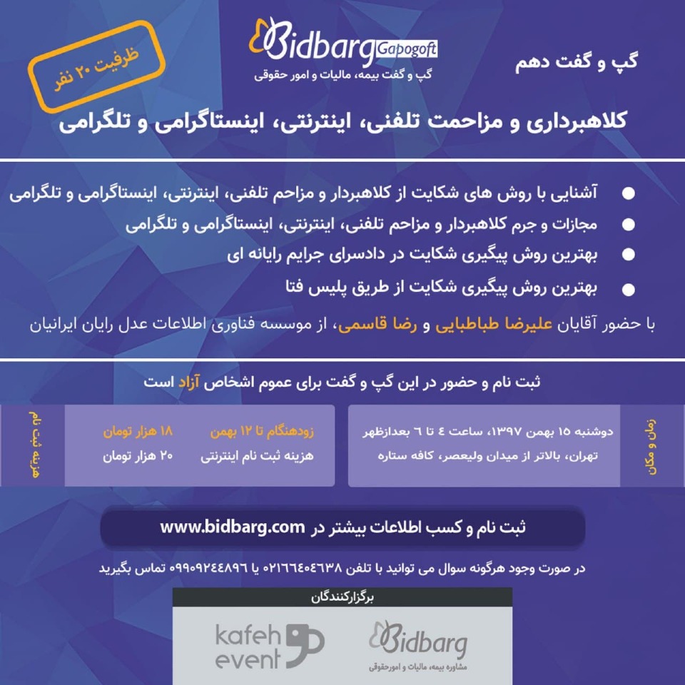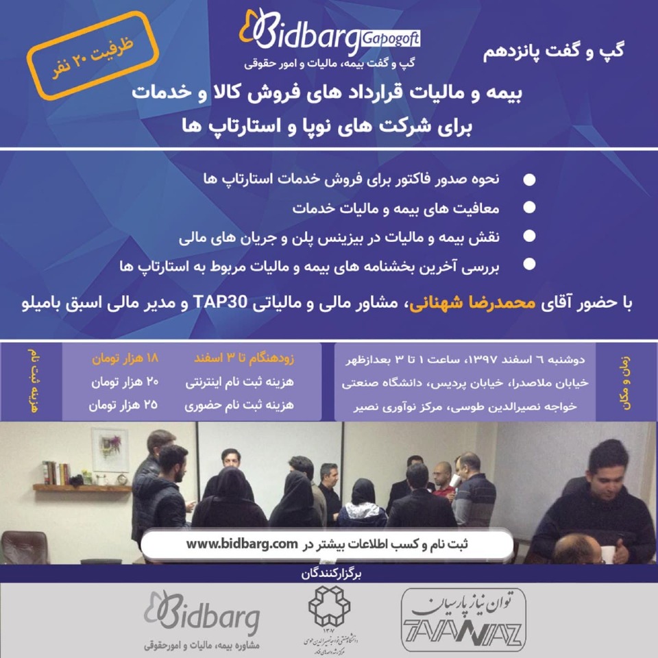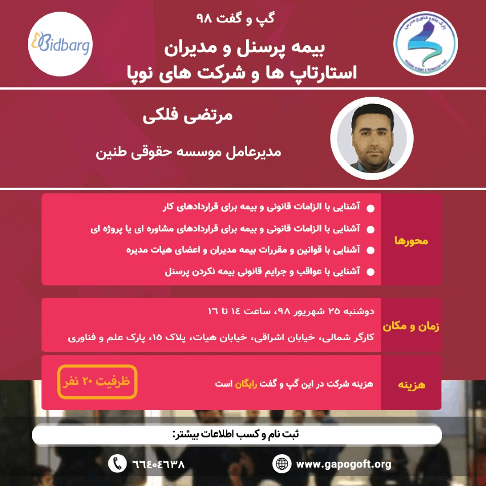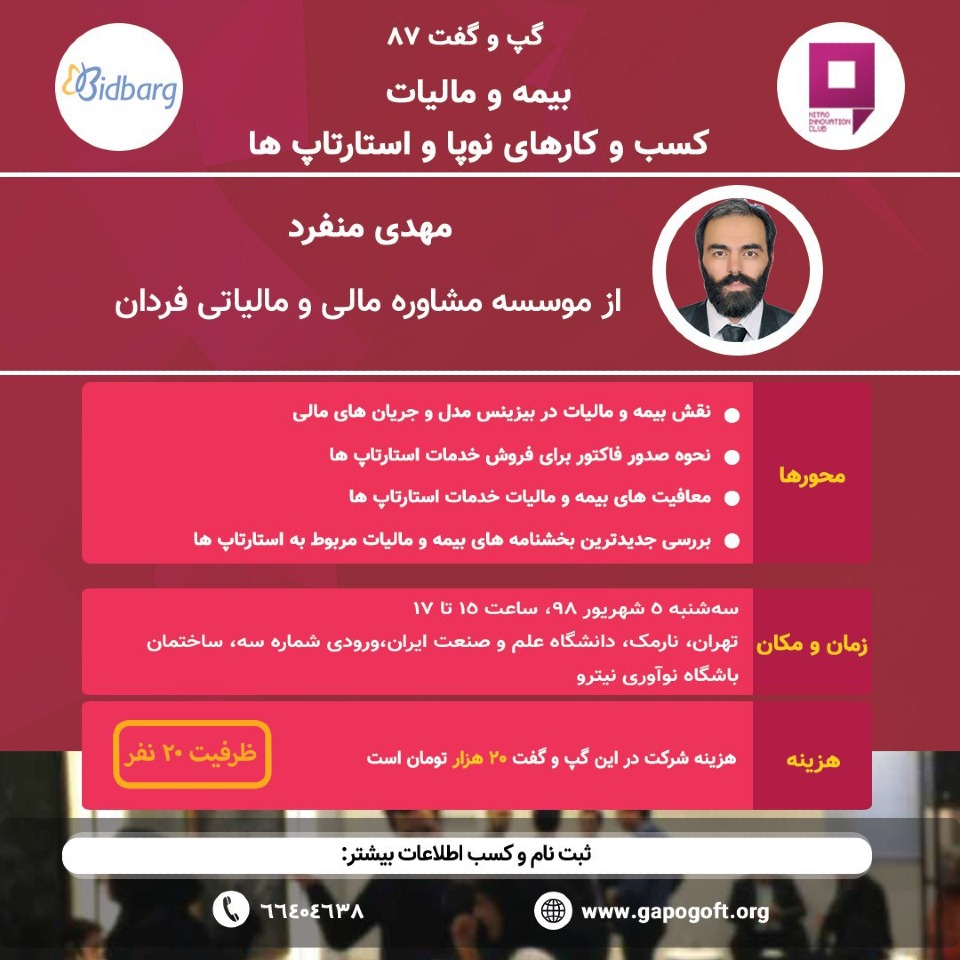 بیدبرگ (شرکت ارتباط گستر بیدبرگ) از آبان سال ۱۳۹۳ شروع به کار کرده است و بر طبق رتبه بندی سایت معتبر Alexa، اکنون جزو ۵۰۰ سایت پربازدید ایران می باشد. بیدبرگ در مرکز توسعه نوآوری دانشگاه صنعتی امیرکبیر مستقر می باشد. بیدبرگ مشاور آگاه شما در حوزه بیمه، مالیات و امور حقوقی می باشد. از طریق بیدبرگ می توانید در همه حوزه های بیمه، قانون کار، مالیات، امور حقوقی و کیفری، مشاوره تلفنی تخصصی دریافت کنید یا پیگیری و اجرای امور خود را به متخصصین همکار بیدبرگ بسپارید. برای ارتباط با پشتیبانی بیدبرگ با شماره تلفنی ۰۲۱۹۱۰۲۳۷۸۴ تماس بگیرید یا درخواست خود را از طریق فرم زیر به اطلاع ما برسانید. https://www.bidbarg.com